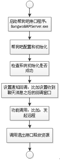 下图说明了一个典型的帮我吧SDK接口的调用流程,即先调用配置和初始化接口进行初始化,然后设置回调窗口,再调用功能类接口,最后调用退出接口释放资源。