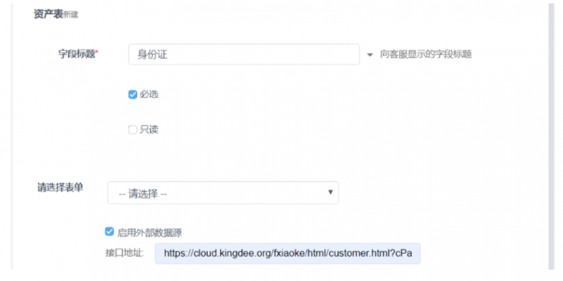 首先创建一个跟关联模块是客户管理的资产表结构一模一样的关联工单的资产表,然后启用外部数据源,请选择表单选项选择关联模块为工单的资产表,在帮我吧配置资产表字段如下: