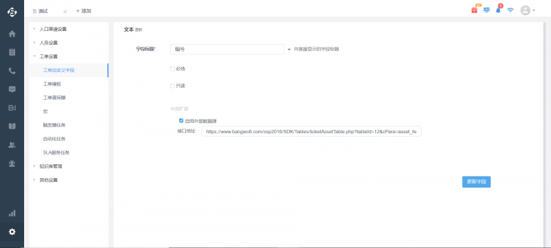 工单外部扩展,指的是工单自定义字段中的两种字段类型(文本,资产表)可支持数据源来自于第三方,及绑定帮我吧客户档案的资产表的数据,然后赋值到工单中,使得工单满足多方对接。对接类型有两大类,一类是文本字段,一类是资产表字段。