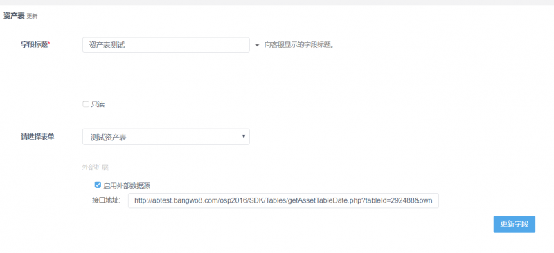 使工单的自定义文本字段在开启外部扩展(启用外部数据源)后能够操作帮我吧自定义资产表,并将数据中的数据对应工单的自定义字段值中。