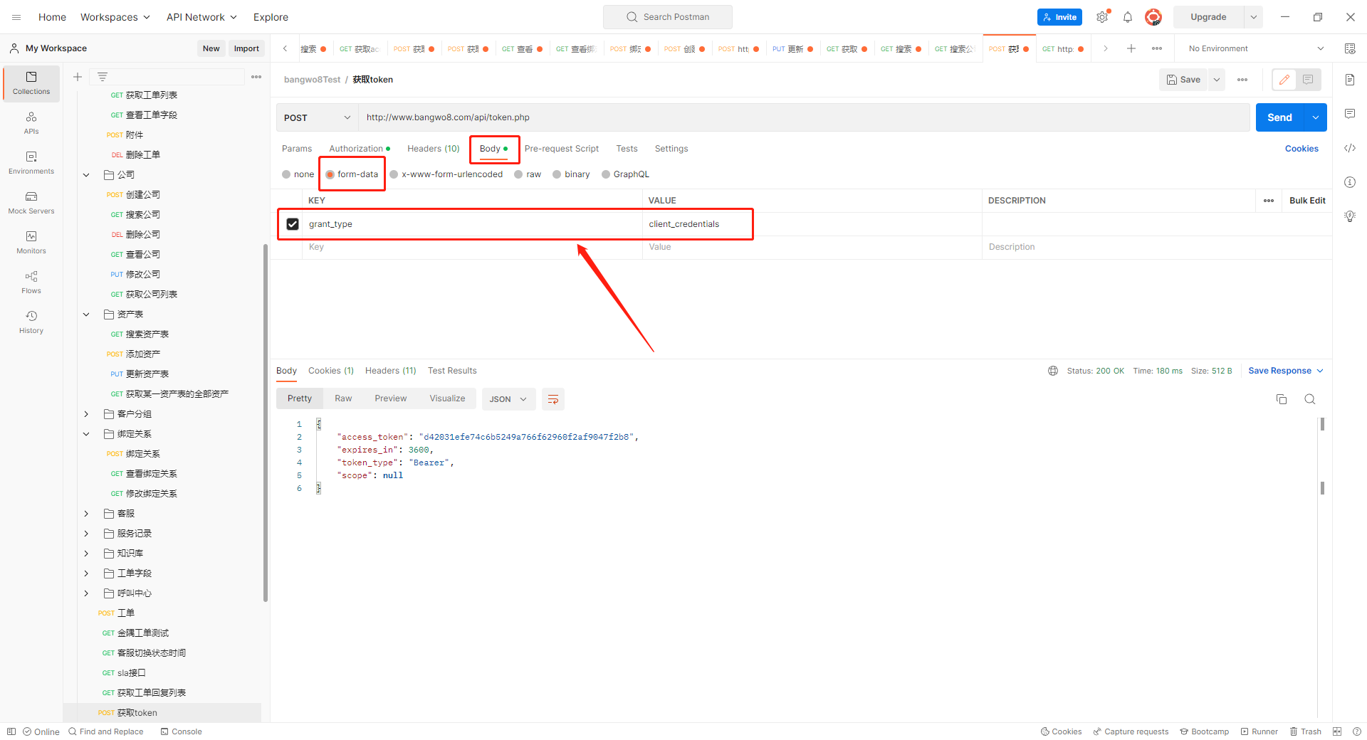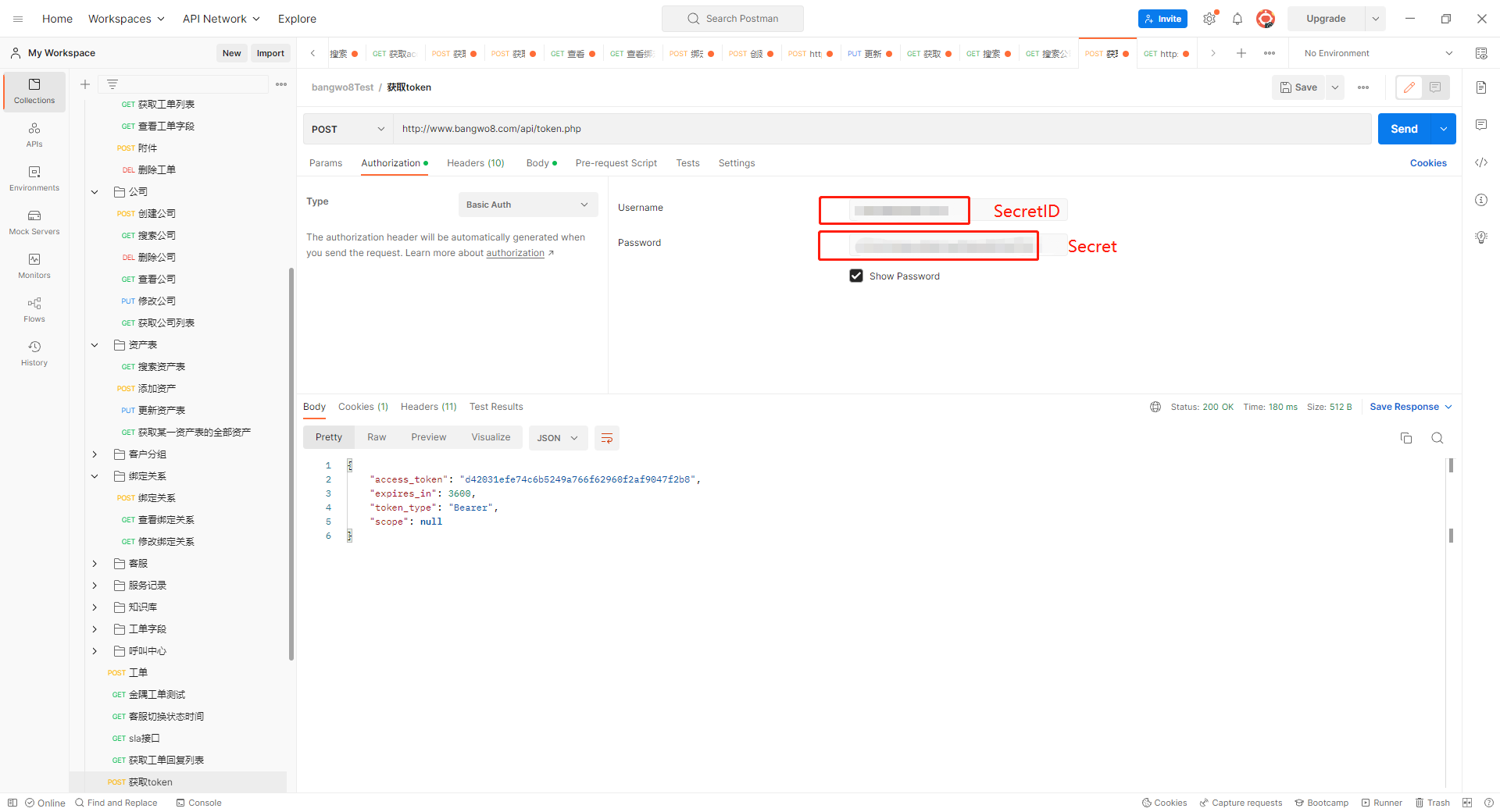 curl -XPOST -F 'grant_type=client_credentials' -u "获取到的SecretID:获取到的secret" https://www.bangwo8.com/api/token.php
