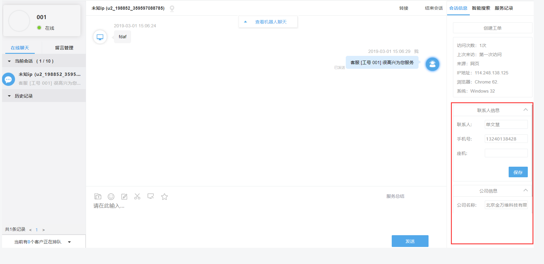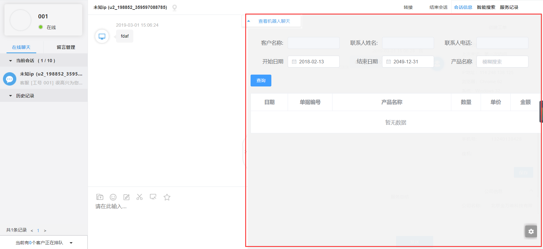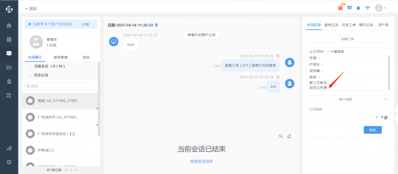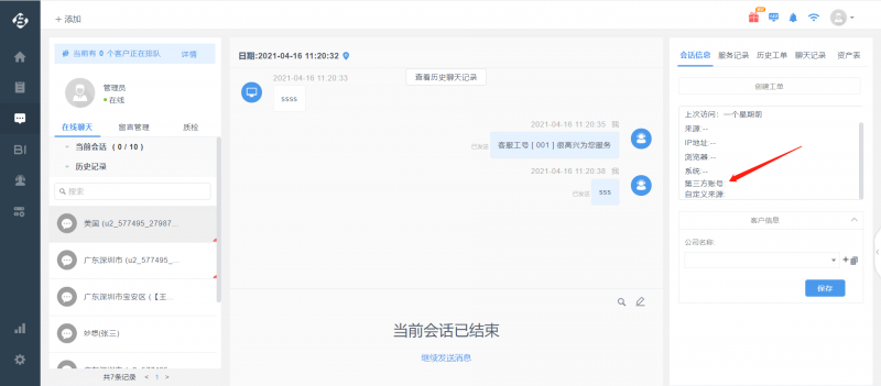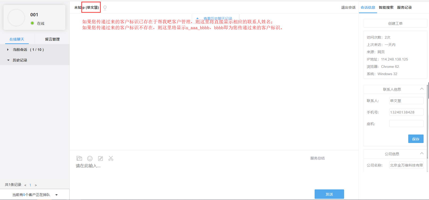 第1和2步完成后,可直接进行试跑,如果传递给帮我吧IM客户端的客户标识已存在于帮我吧客户管理,则客服工作台上将自动匹配出联系人和公司信息。