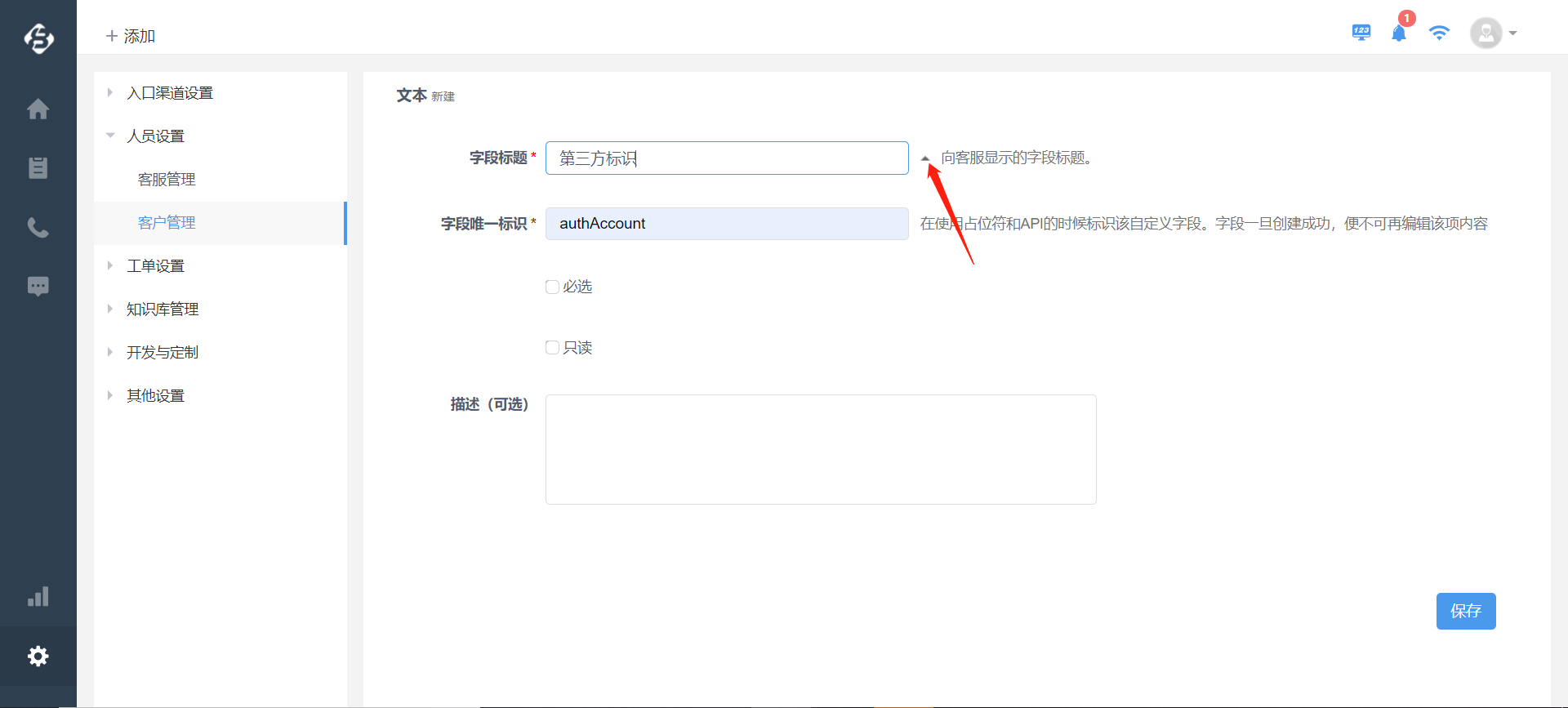 (1)帮我吧客户管理下的联系人添加“单行文本”类型的自定义字段,字段唯一标识需设置为“authAccount”。