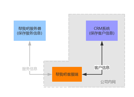 在这种情况下,CRM系统和帮我吧客服端可能都部署在服务商的内部局域网中,所以CRM系统也无需向外网暴露任何服务接口,这极大地保障了服务商CRM系统中客户信息的安全性。