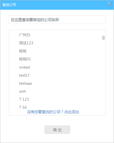 CRM系统在此内嵌URL中实现的页面如下图所示,需要在此接口页面中提供搜索、选择一个已有公司,以及创建新公司的功能。此外,此页面需要能够把搜索的时候匹配选中的公司ID、公司名称,或者新创建的公司ID返回给帮我吧客服端。具体返回信息给帮我吧客服端的方式是调用帮我吧客服端给内嵌浏览器窗口提供的扩展JavaScript函数。