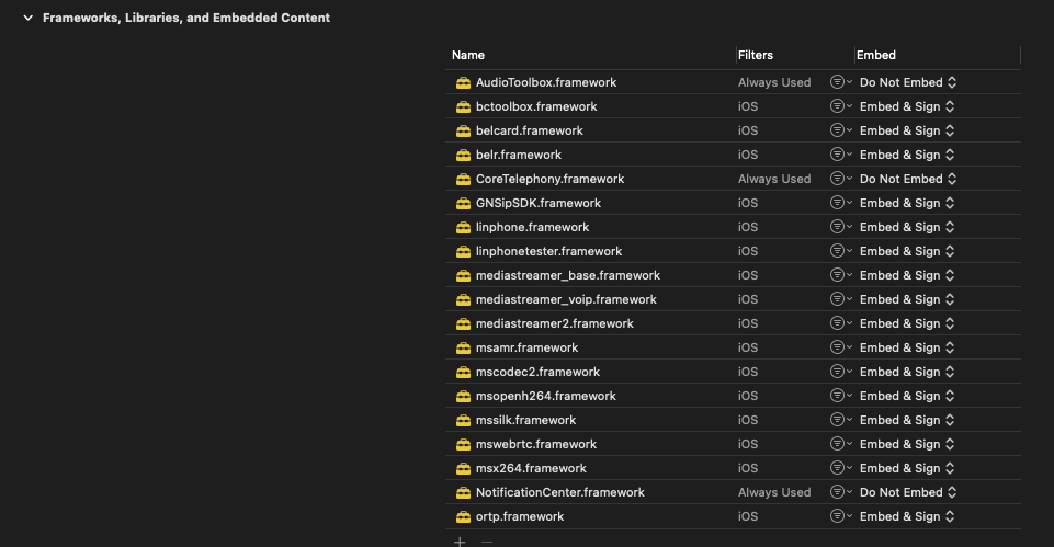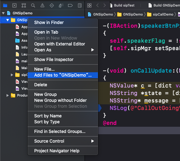 1.解压在GNSipSDK.zip, 将解压后的文件夹,拷贝到现有的工程目录下 2.将GNSipSDK目录,整个添加到xcode工程里 3.设置GNSipSDK里的franmework为Embed & Sign 4.在Info.plist里,设置麦克风权限 5.参考demo中的示例,编写代码